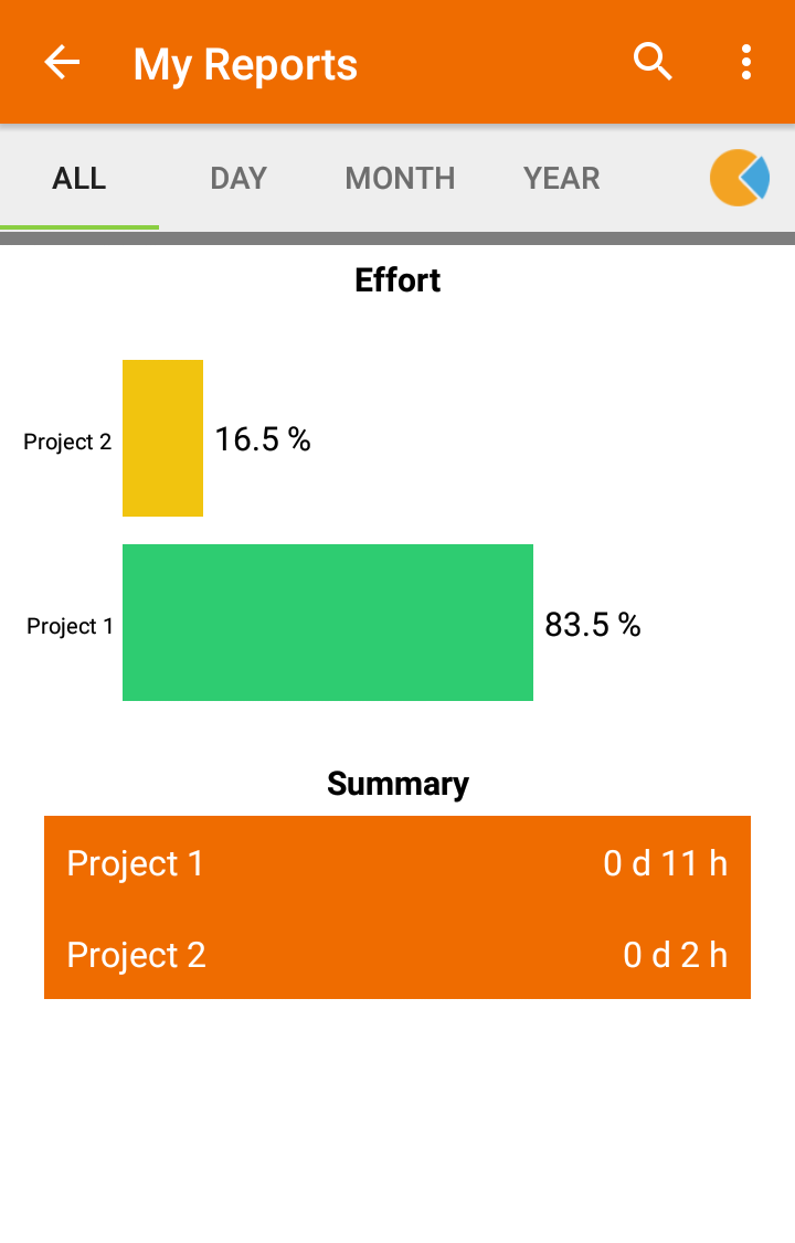 The pie chart icon option allows us to graphically visualize both, the effort spent on each project (as a percentage of total time) and the summary of the time spent on each project. This is an example of the charts |